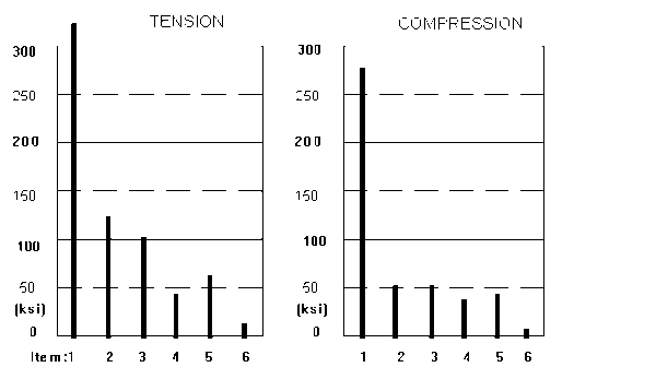 to 333,000 psi in tension. Compression failure excedes 275,000 psi. Lab