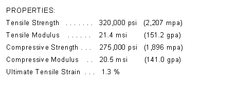 to 333,000 psi in tension. Compression failure excedes 275,000 psi. Lab